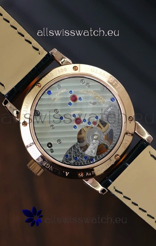 Genuine Black Leather Strap with A.Lange Sohne Stamped Markings on Strap. Polished Stainless Steel Rose Gold Clasps.