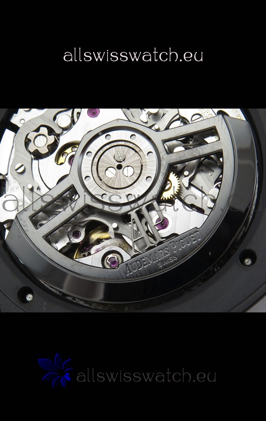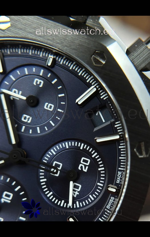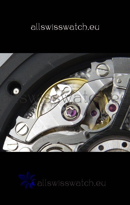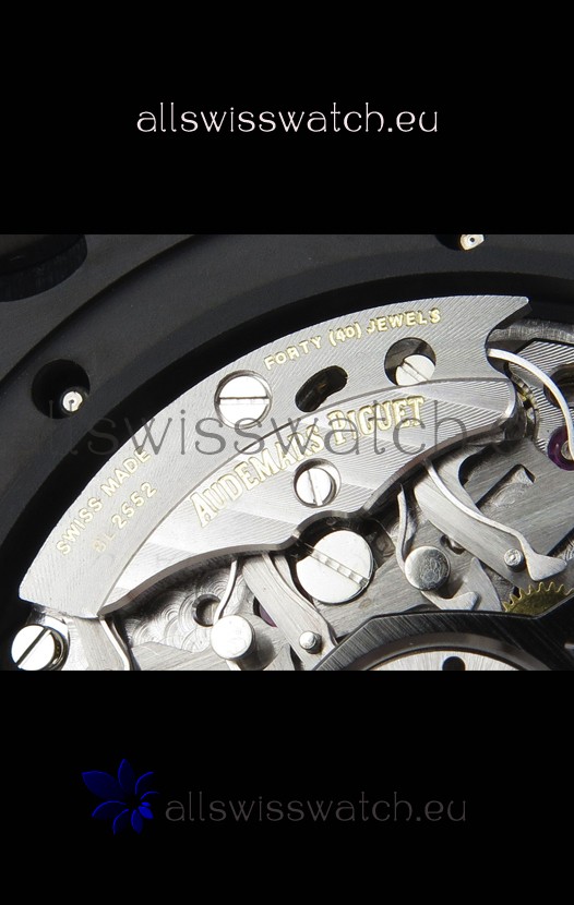 Machinery Layout exactly like Audemars Piguet 3126 Calibre Movement used in Authentic Audemars Piguet Offshore Watches. Built on Genuine Swiss 7753 Movement architecture with Functional stopwatch feature like the authentic with Seconds hand running at the 12 o clock Sub Dial