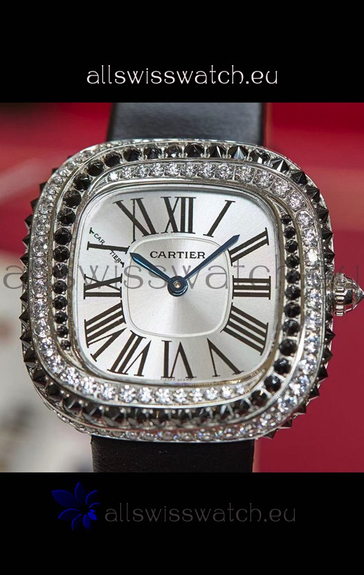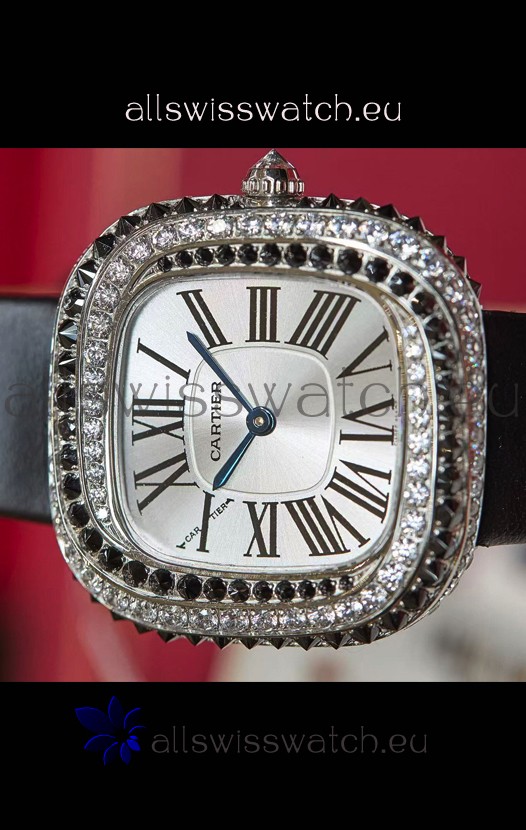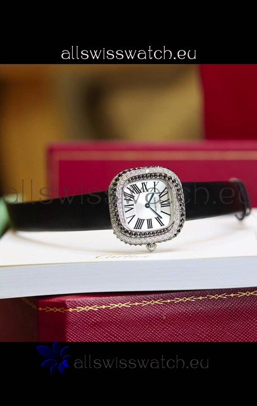 Coussin De Cartier Steel Watch Swiss Replica Watch Black Strap