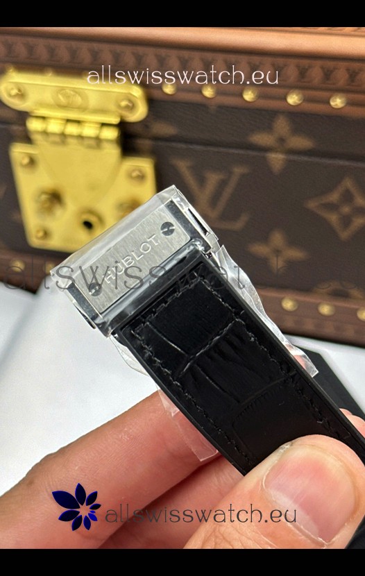 Genuine Hybrid Crocodile/Rubber Strap with Stainless Steel Folding Clasp complete with Hublot Markings and Engravings.
