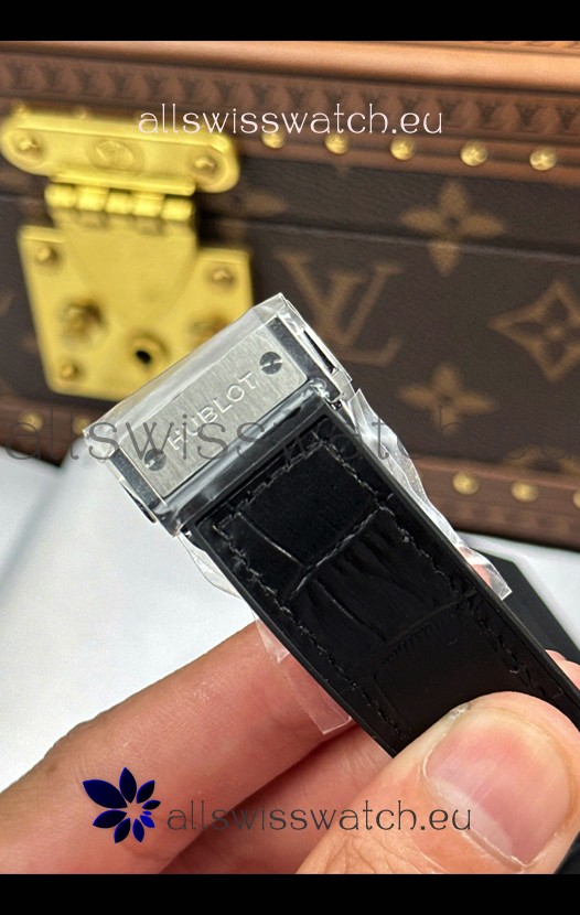 Genuine Hybrid Crocodile/Rubber Strap with Stainless Steel Folding Clasp complete with Hublot Markings and Engravings.