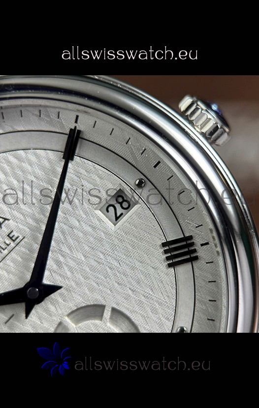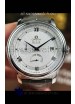 White Dial with Sub dials for Power Reserve and Seconds Hand Indicator with Date Indicator at 3 O'Clock