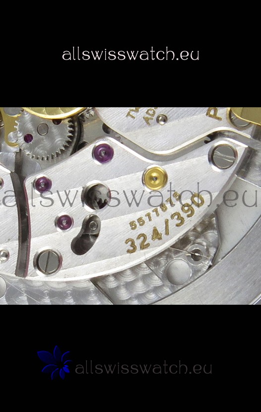 Genuine Swiss 9015 Movement assembled to Resemble the Authentic Patek Philippe PP 324 CS Calibre Style Movement. Updated Rotor, Bridged and Engravings on Movement.
