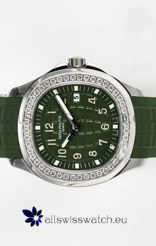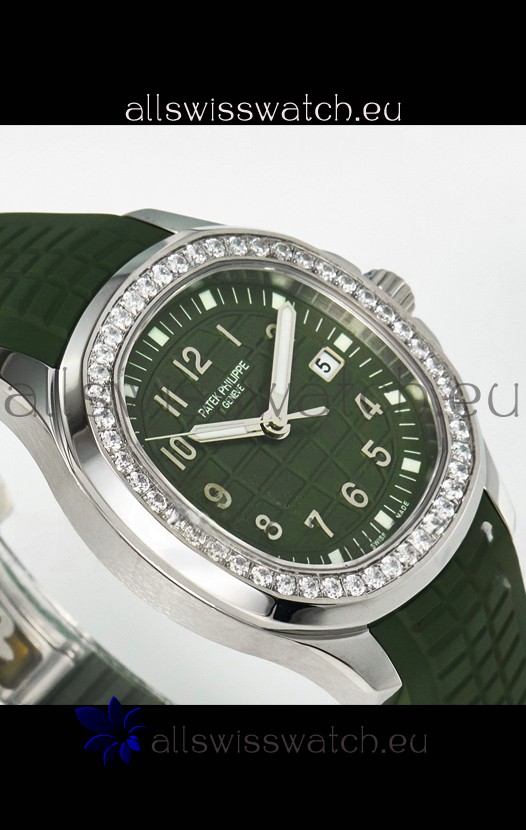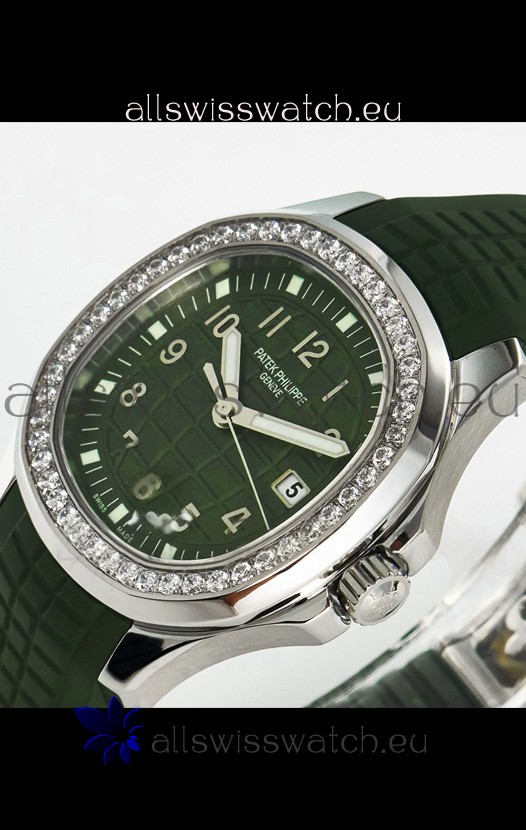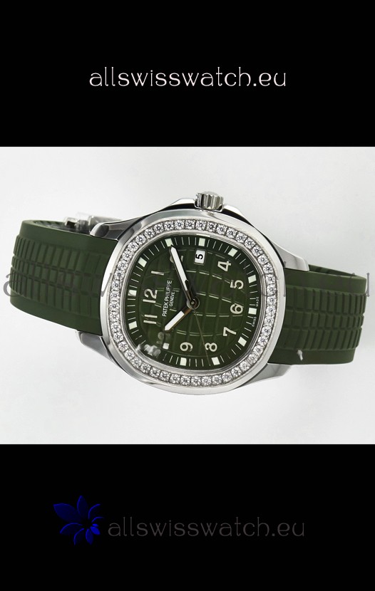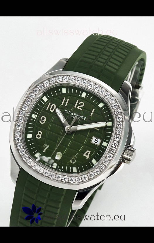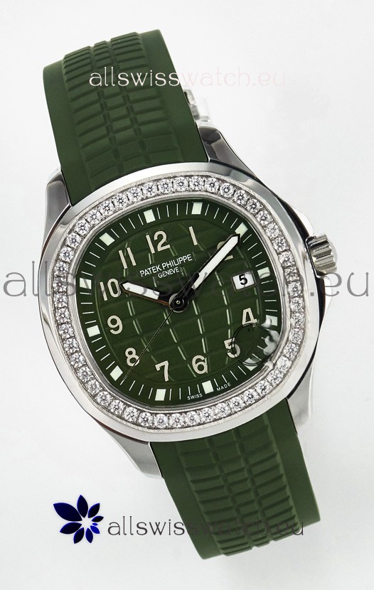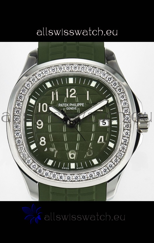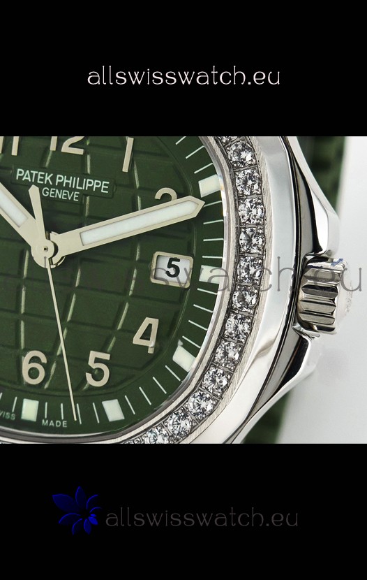 Green Textured Dial with with Date Indicator. Swiss Cut Diamonds Bezel
