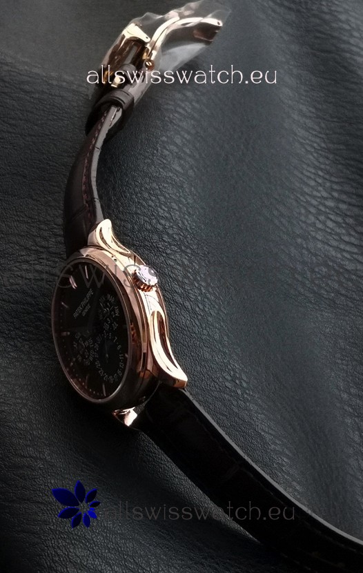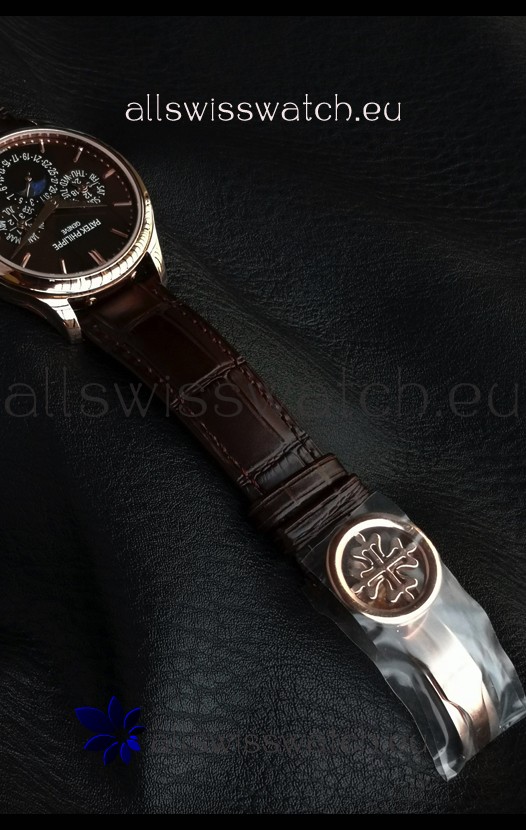 Genuine Leather Strap with Rose Gold Plated Folding Clasp complete with Patek Philippe Markings.