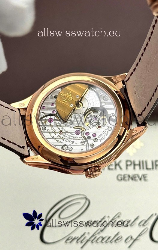 Genuine Swiss 9015 Movement assembled to Resemble the Authentic Patek Philippe PP 324 Calibre Style Movement. Updated Rotor, Bridged and Engravings on Movement with Rose Gold Plated Patek Philippe Stamped Rotor