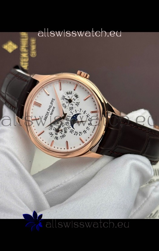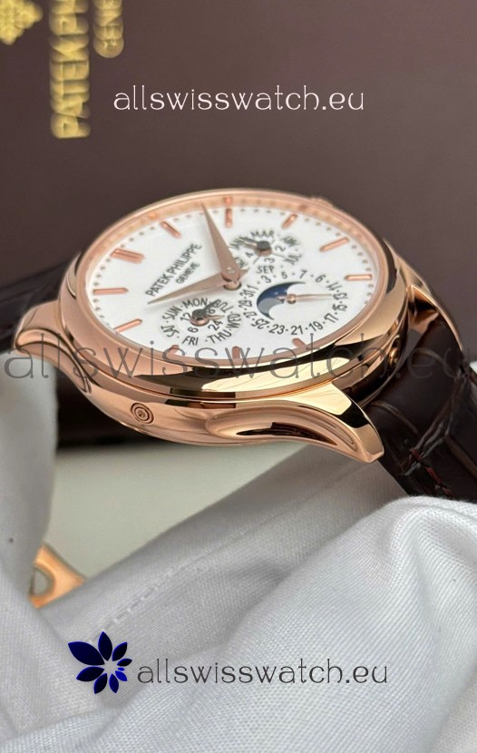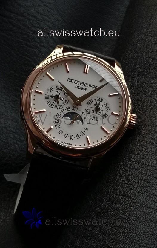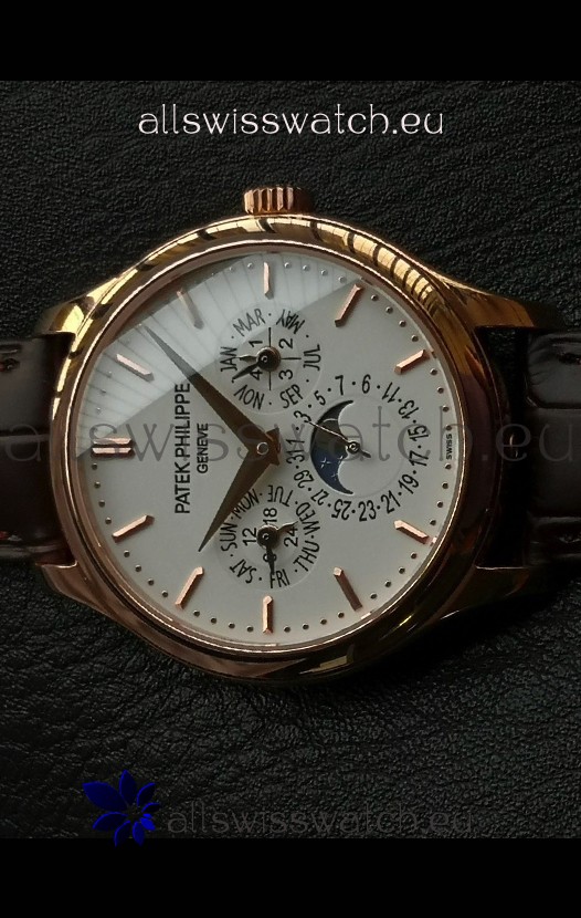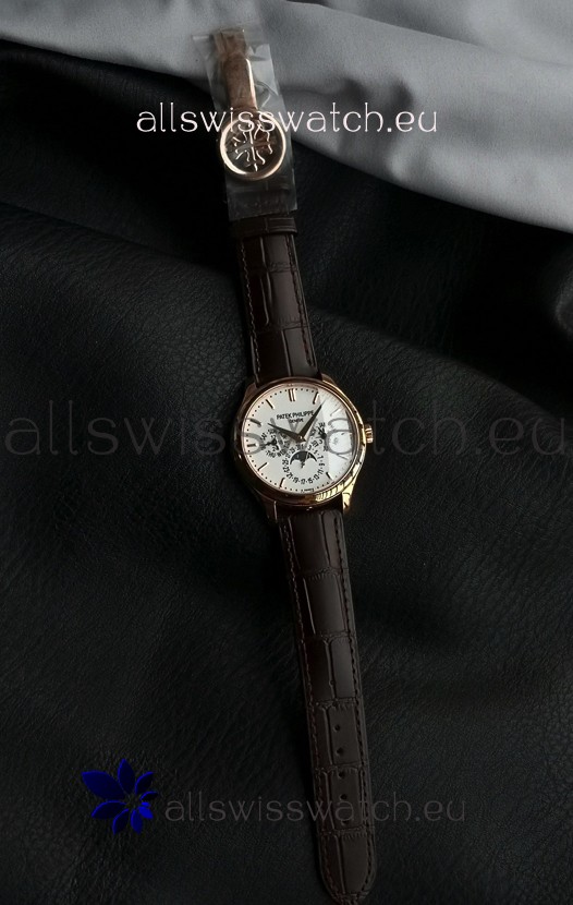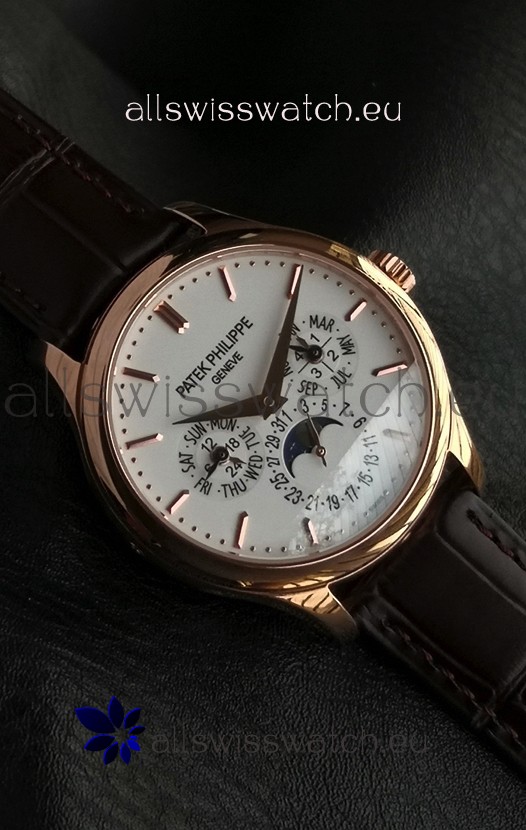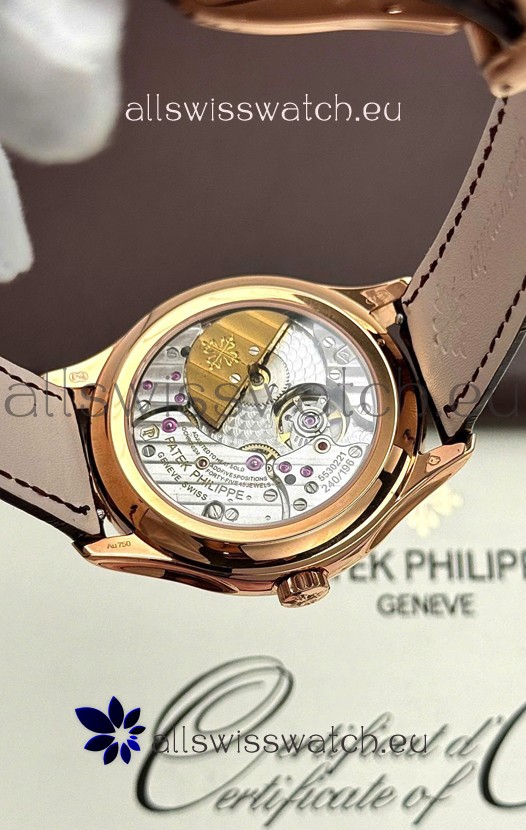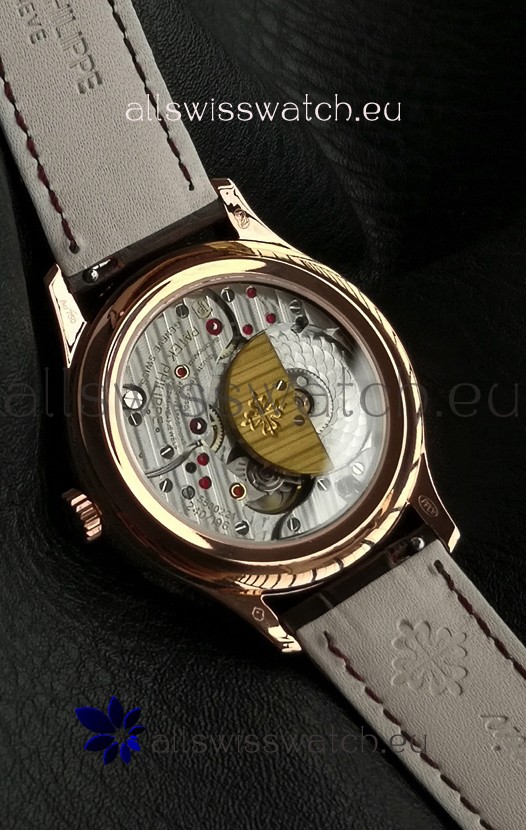 Genuine Swiss 9015 Movement assembled to Resemble the Authentic Patek Philippe PP 324 Calibre Style Movement. Updated Rotor, Bridged and Engravings on Movement with Rose Gold Plated Patek Philippe Stamped Rotor