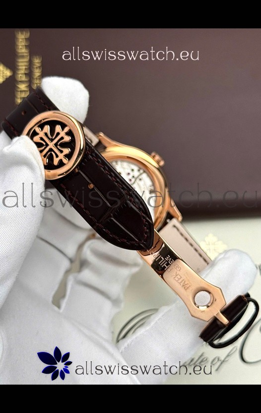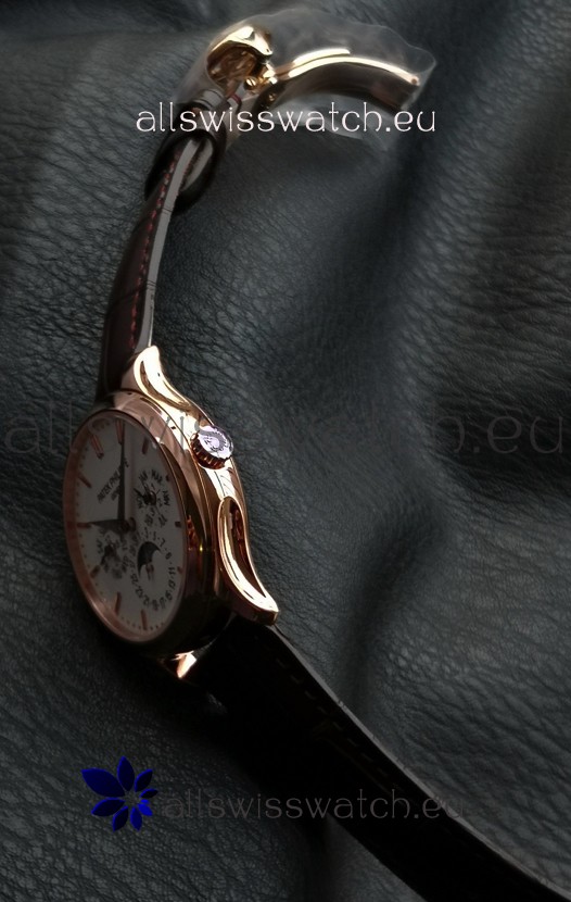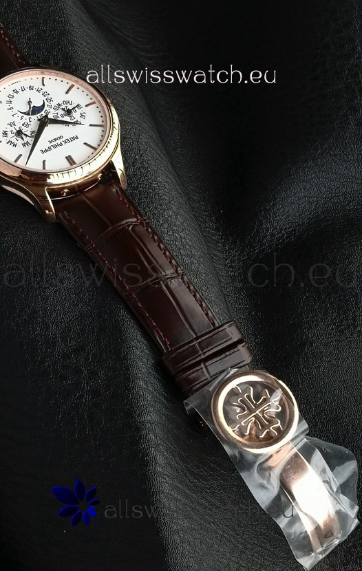 Genuine Leather Strap with Rose Gold Plated Folding Clasp complete with Patek Philippe Markings.