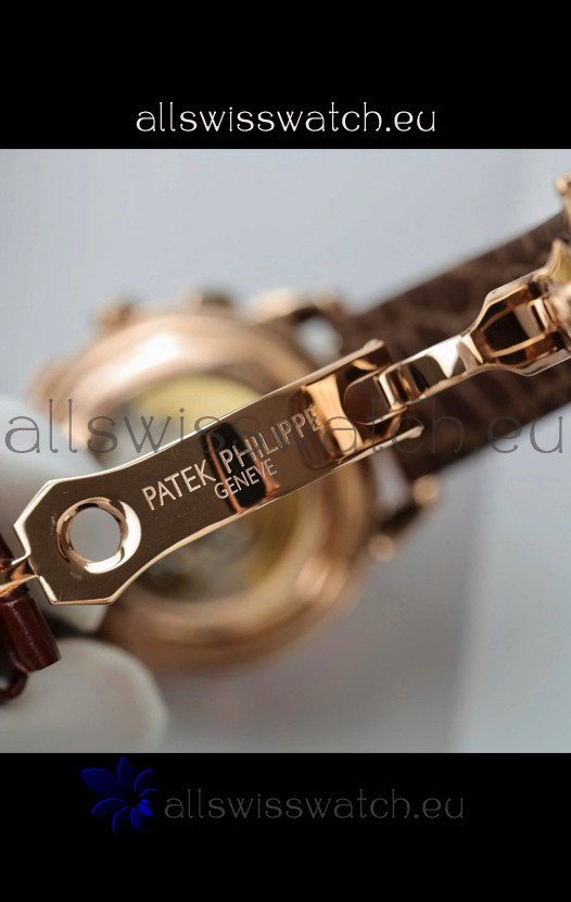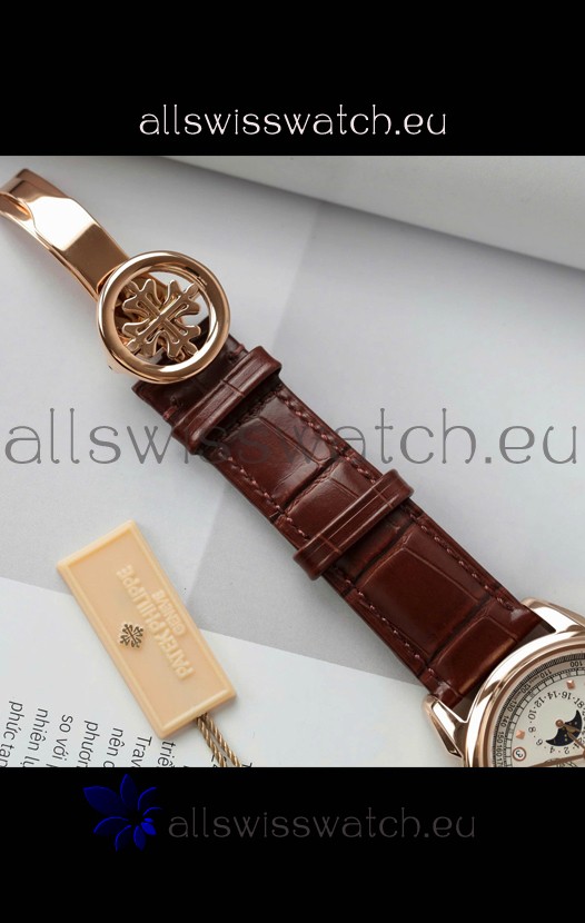 Genuine Leather Strap with Rose Gold Plated Folding Clasp complete with Patek Philippe Markings.