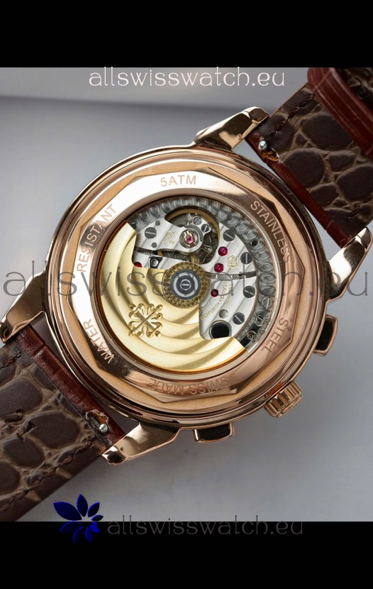 Genuine Swiss 9015 Movement assembled to Resemble the Authentic Patek Philippe PP 324 Calibre Style Movement. Updated Rotor, Bridged and Engravings on Movement with Rose Gold Plated Patek Philippe Stamped Rotor
