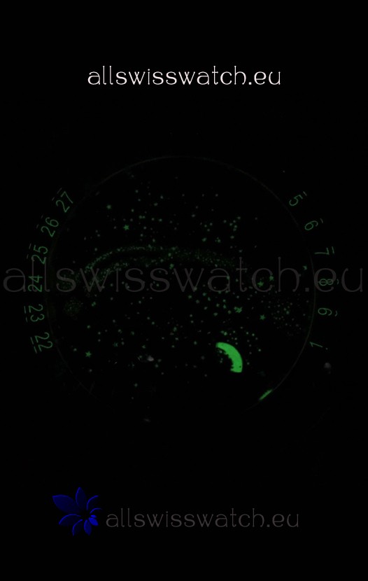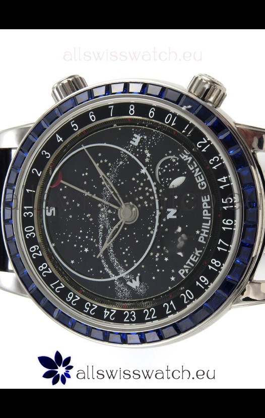 Black Sky Moon Celestial Dial with Date Numerals around the Dial. Sapphires Bezel