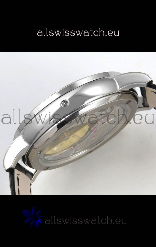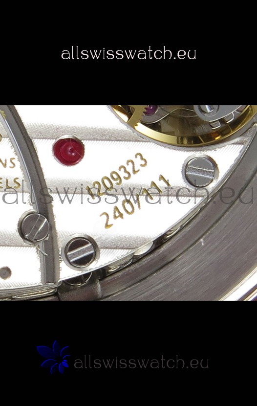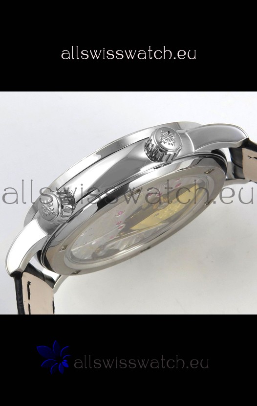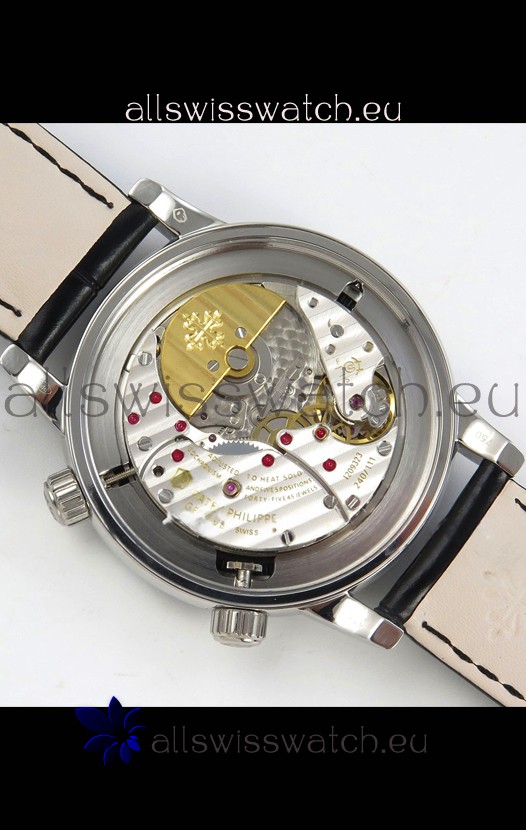 Genuine Swiss 9015 Movement assembled to Resemble the Authentic Patek Philippe PP 240 Calibre Style Movement. Updated Rotor, Bridged and Engravings on Movement with Rose Gold Plated Patek Philippe Stamped Rotor