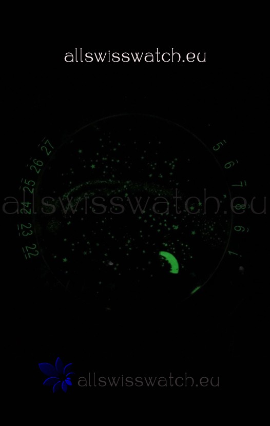 Black Sky Moon Celestial Dial with Date Numerals around the Dial. Sapphires Bezel