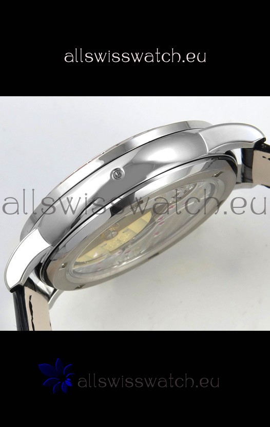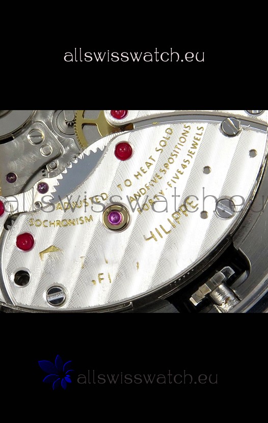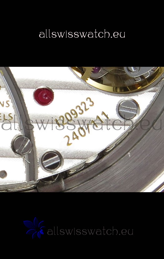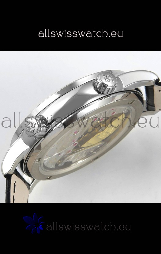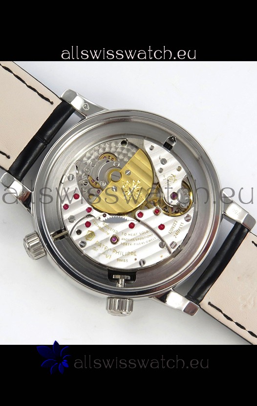 Genuine Swiss 9015 Movement assembled to Resemble the Authentic Patek Philippe PP 240 Calibre Style Movement. Updated Rotor, Bridged and Engravings on Movement with Rose Gold Plated Patek Philippe Stamped Rotor