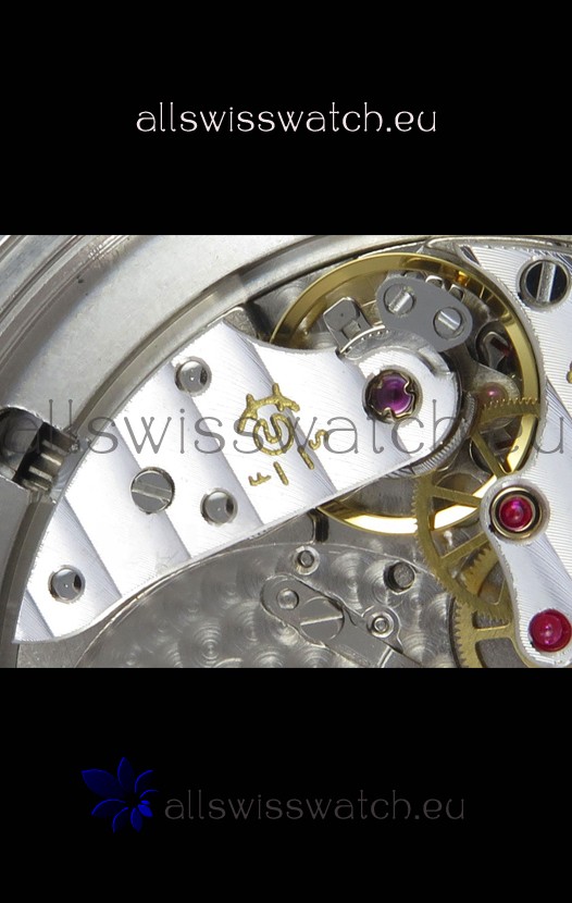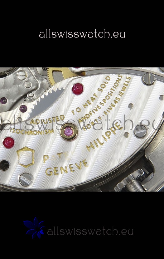 Genuine Swiss 9015 Movement assembled to Resemble the Authentic Patek Philippe PP 240 Calibre Style Movement. Updated Rotor, Bridged and Engravings on Movement with Rose Gold Plated Patek Philippe Stamped Rotor