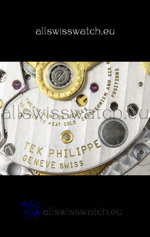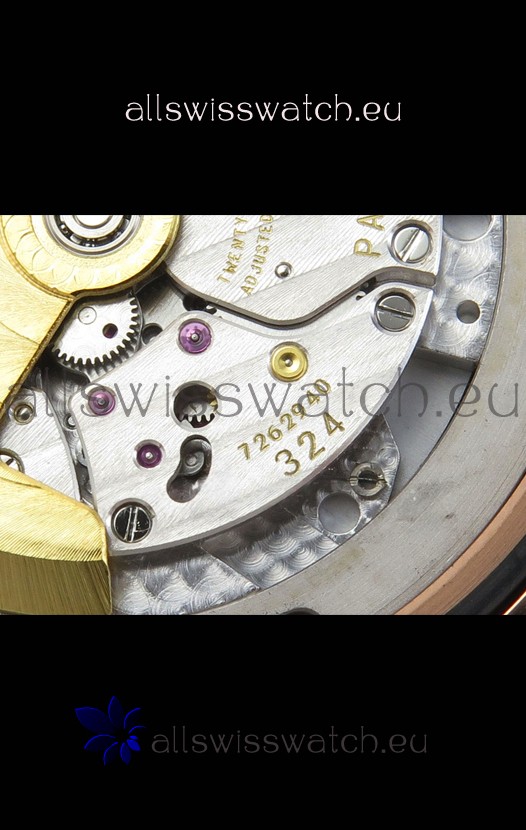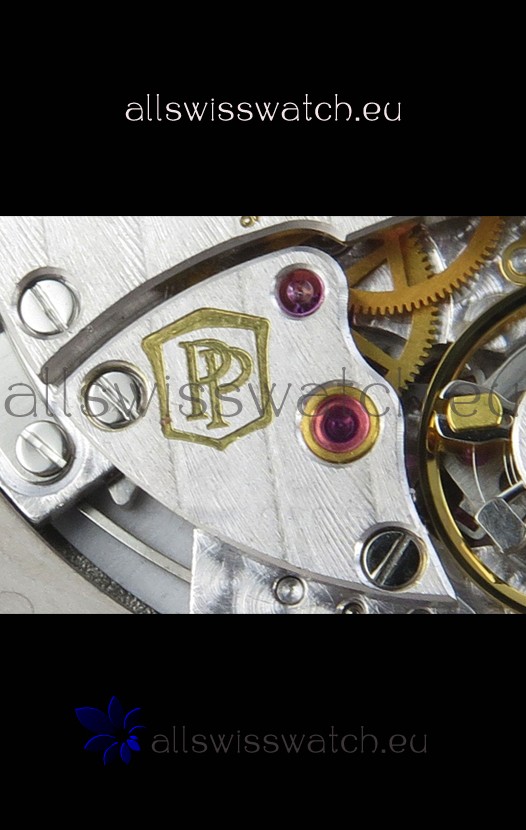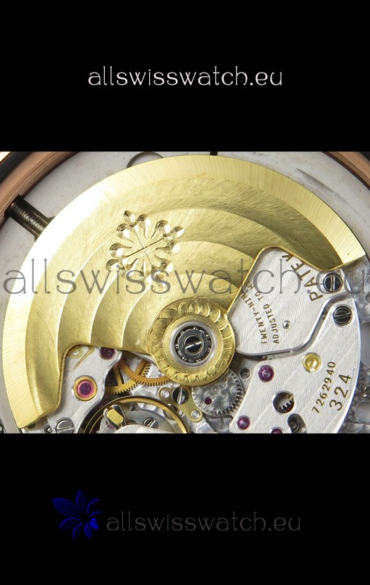 Genuine Swiss 9015 Movement assembled to Resemble the Authentic Patek Philippe PP SC324 Calibre Style Movement. Updated Rotor, Bridged and Engravings on Movement.