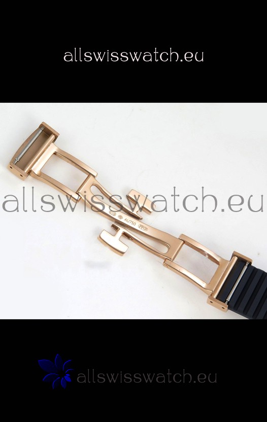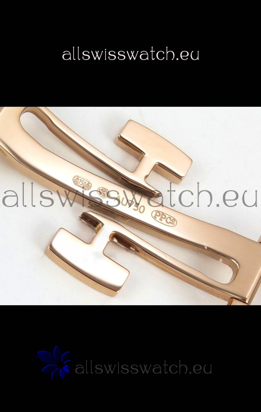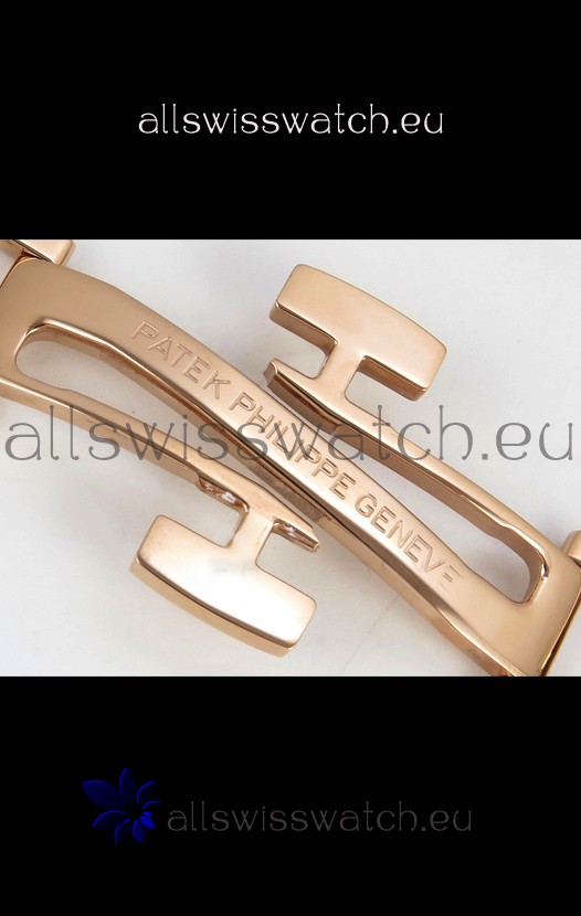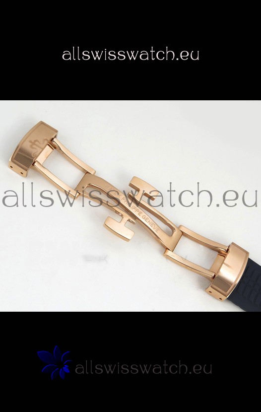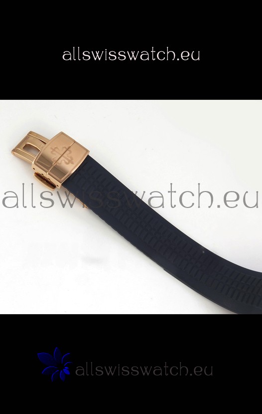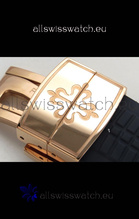 Brown Curved Rubber Strap with Rose Gold Plating on Steel Folding Clasp complete with Patek Philippe Markings. A Highly Updated Clasps for this series with much more accurate markings/engravings.