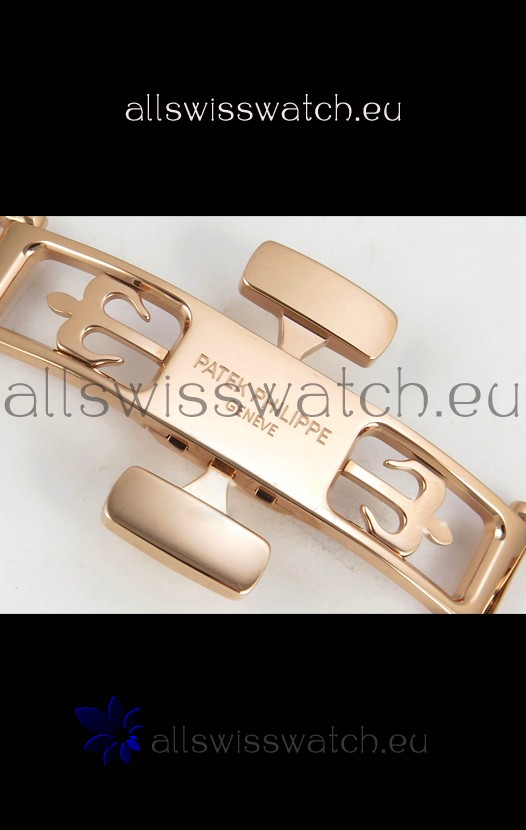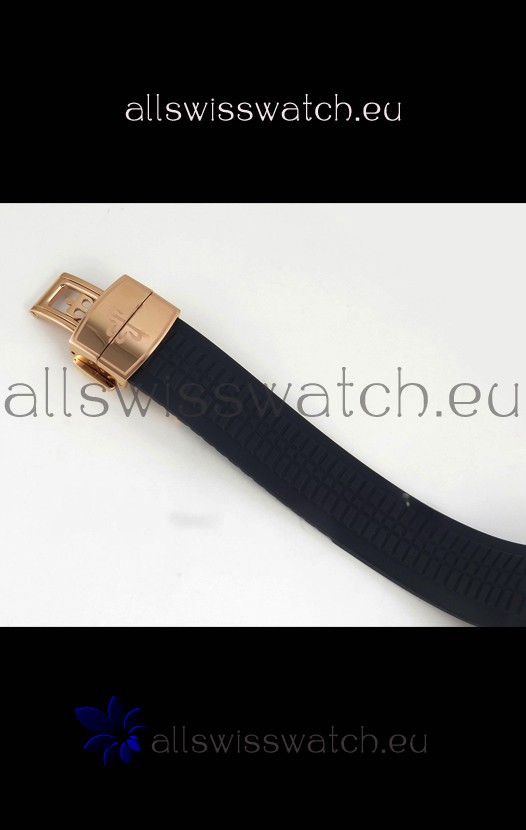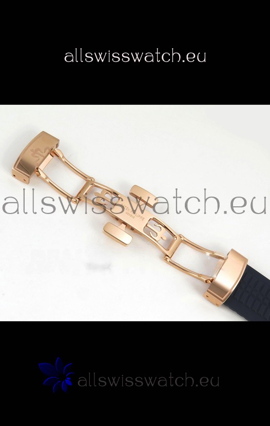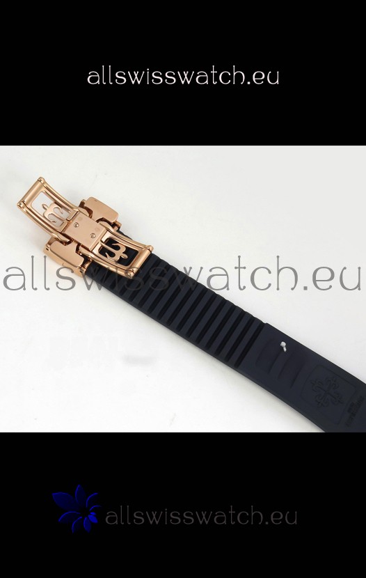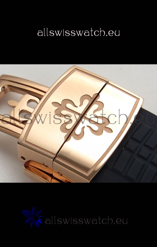 Brown Curved Rubber Strap with Rose Gold Plating on Steel Folding Clasp complete with Patek Philippe Markings. A Highly Updated Clasps for this series with much more accurate markings/engravings.