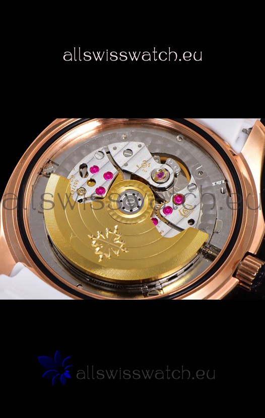 Genuine Swiss 9015 Movement assembled to Resemble the Authentic Patek Philippe PP 324SC Calibre Style Movement. Updated Rotor, Bridged and Engravings on Movement.