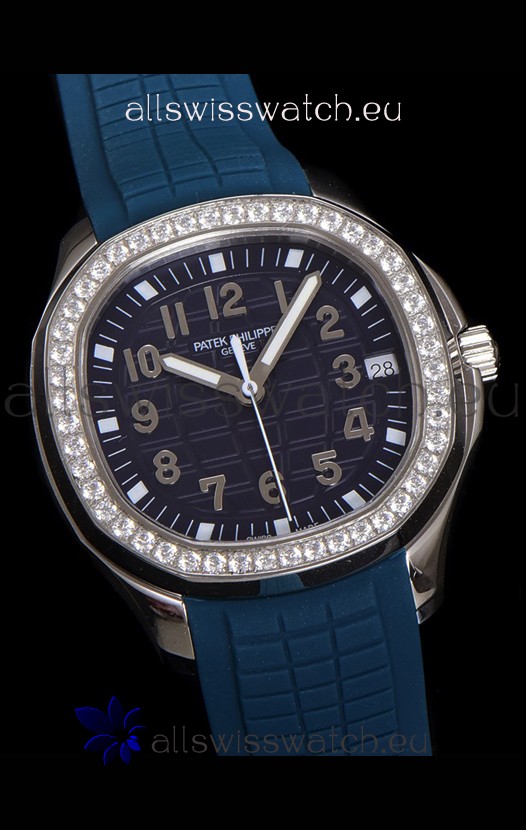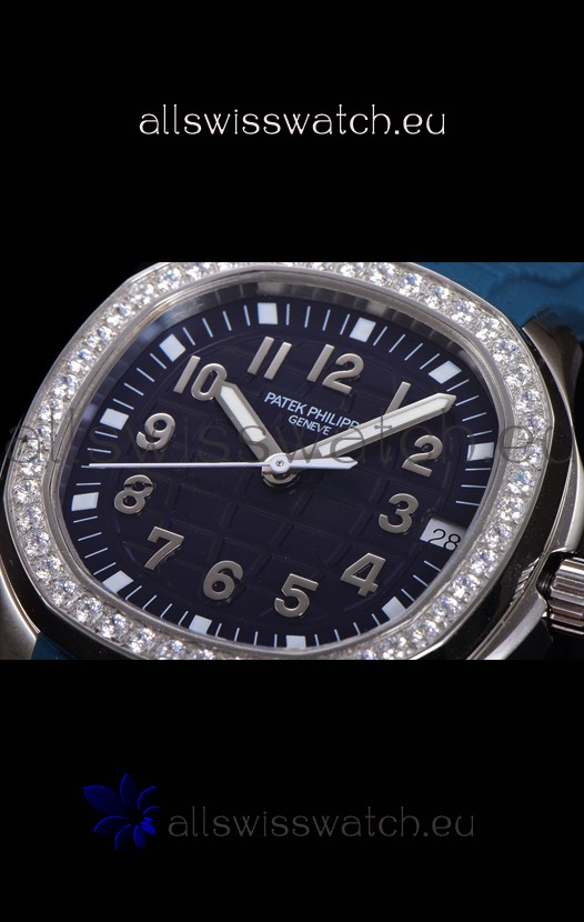 Blue Colored Textured Dial with Date Window at 3 O'Clock. Diamonds Bezel