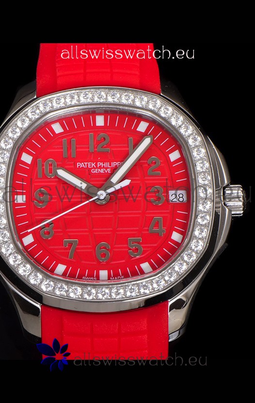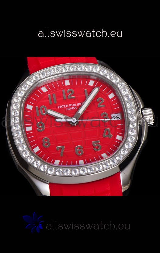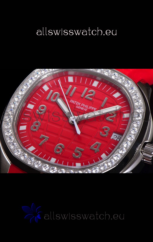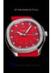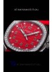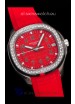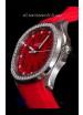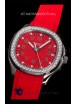 Red Colored Textured Dial with Date Window at 3 O'Clock. Diamonds Bezel