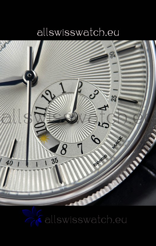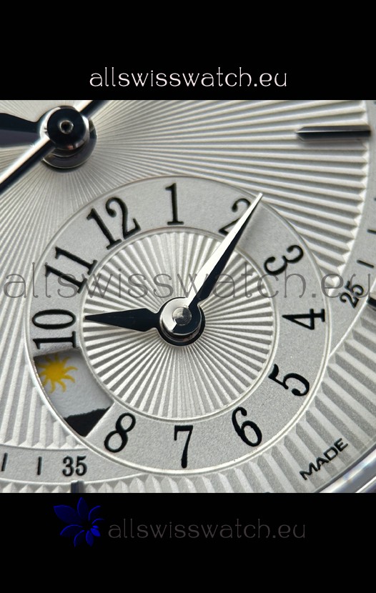 Genuine Swiss ETA3165 Thirty-one Jewels Movement; 28,800 VPH. Dual Time Feature available on this Watch
